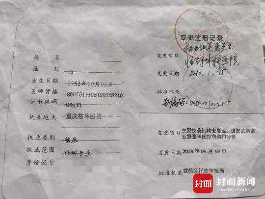 根据国家卫生健康委员会的执业医师官方查询渠道显示,这位罗姓医生具有外科专业执业资格,但目前已不在熹亚美容门诊部执业,而是注册到了重庆一家医疗美容机构进行执业。
