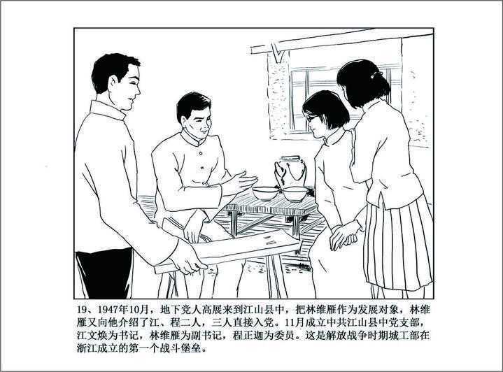 二人在交谈中,林维雁向高展直言在这里令人窒息,日夜向往解放区。高展深知林维雁对党的热爱、对新中国的热切期盼,便如实坦言自己来江山找她开辟革命阵地,因江山是战略要地,希望有更多志同道合的同志参与。林维雁便向高介绍了同校任教的江、程二人,他们都是学运积极分子。江文焕、林维雁、程正迦都是学运的负责人和组织者,三人曾计划一旦路资蓄足即北上投奔解放区。高展喜上心头,晚饭后便和林维雁同去江文焕、程正迦的寓所会见,在交谈中,高展发现江文焕有渊博的才识和对党的深刻认识,对他敬佩有加。几经接触,高展对他们说,到解放区参加革命,在蒋管区参加地下斗争,开辟第二战线,配合解放军第一战线的战斗,加速国民党反动统治的灭亡,同样是光荣的革命斗争。浙江是蒋介石的后园,江山是“三毛一戴”的老巢。在这样的地区开展斗争,没有人地两熟的当地人参加,其艰难程度是难以想象的。经过高展的一席开导,他们便放弃北上计划,决意留在当地参加开辟第二战线的斗争。1947年10月,林维雁、江文焕、程正迦三人经高展介绍正式加入了中国共产党。11月,中共江山县中党支部成立,江文焕任书记,林维雁任副书记,程正迦为委员。这是解放战争时期城工部在浙江成立的第一个战斗堡垒。
