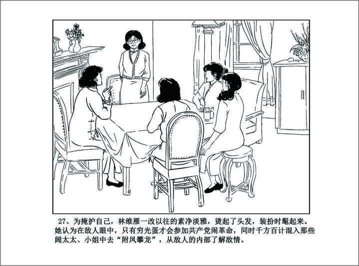 此时的林维雁一改往日的素净淡雅,烫起了头发,装扮也时髦起来。她和程正迦说,这样做是为了掩护自己,在敌人的眼光中,只有穷光蛋才会参加共产党闹革命;同时她千方百计混入那些阔太太、小姐中去“附凤攀龙”,从敌人内部了解敌情,程正迦等人都为她的安危担心,多次劝她小心,林维雁只是笑了笑,说没事的!