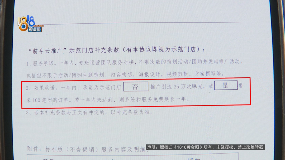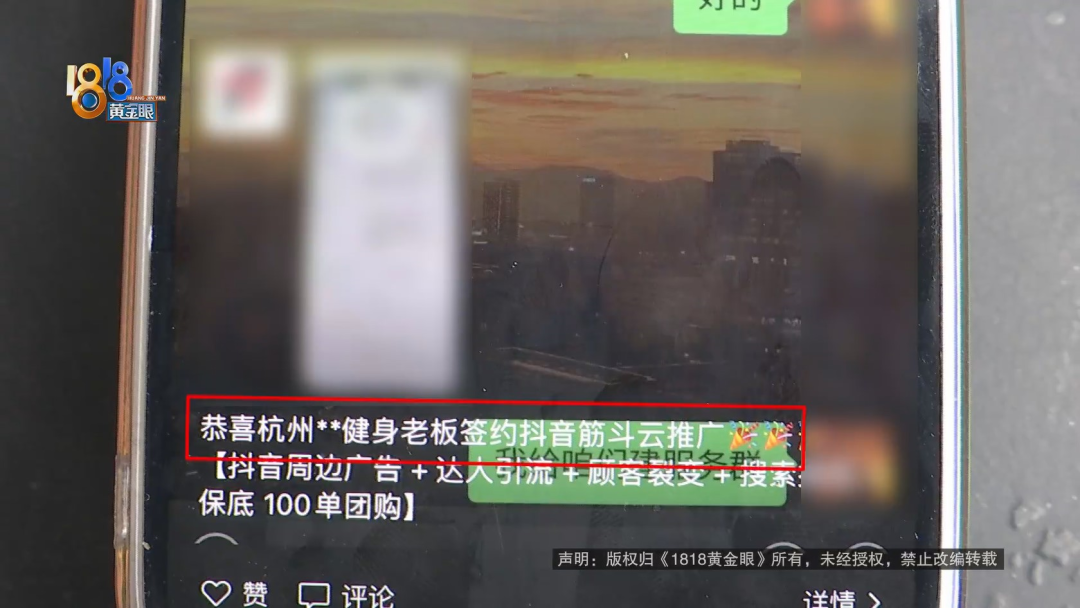 从截图来看,朋友圈文案写着“恭喜杭州某某健身老板签约抖音筋斗云推广”。目前,那位工作人员已经把莫女士屏蔽了,看不到朋友圈,简介上写着“抖音团购推广”。记者尝试用其它账号发起好友申请,对方没有通过。2月14号,莫女士签了一份“筋斗云推广”合作服务协议,甲方是莫女士的工作室,乙方是杭州求变网络有限公司,合同总价6980元每年,补充条款里的“效果承诺”写着:一年内,承诺为示范门店带来100笔团购订单,若一年内未达到,系统和服务免费延长一年。记者注意到合同里还有一条,“甲乙双方确定合作,则不再退款。”莫女士说,当时她没有仔细看。