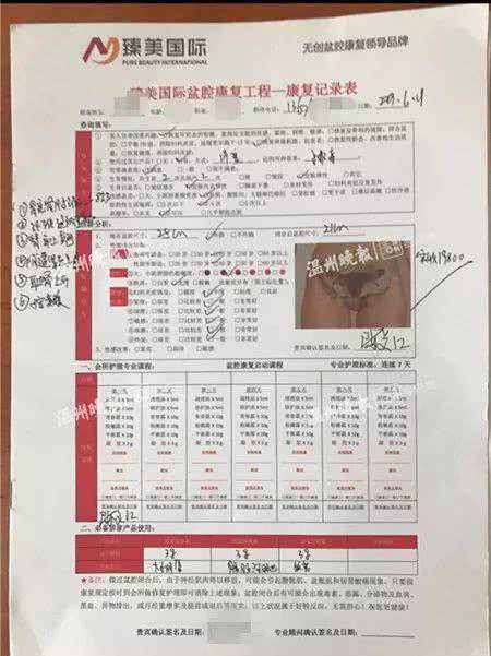 陈女士当初付费后签过一份《臻美国际盆腔康复工程—康复记录表》,上面记录了盆腔闭合前后的尺寸,还有一系列"疗效",在备注栏写着:"做过盆腔闭合后,由于神经肌肉得以释放,可能会引起腰骶肌、盆骶肌和韧带酸痛现象。只要按康复规定按时到会所做修复护理,即可消除上述现象。"