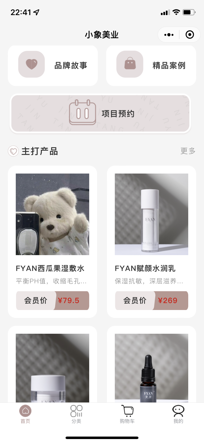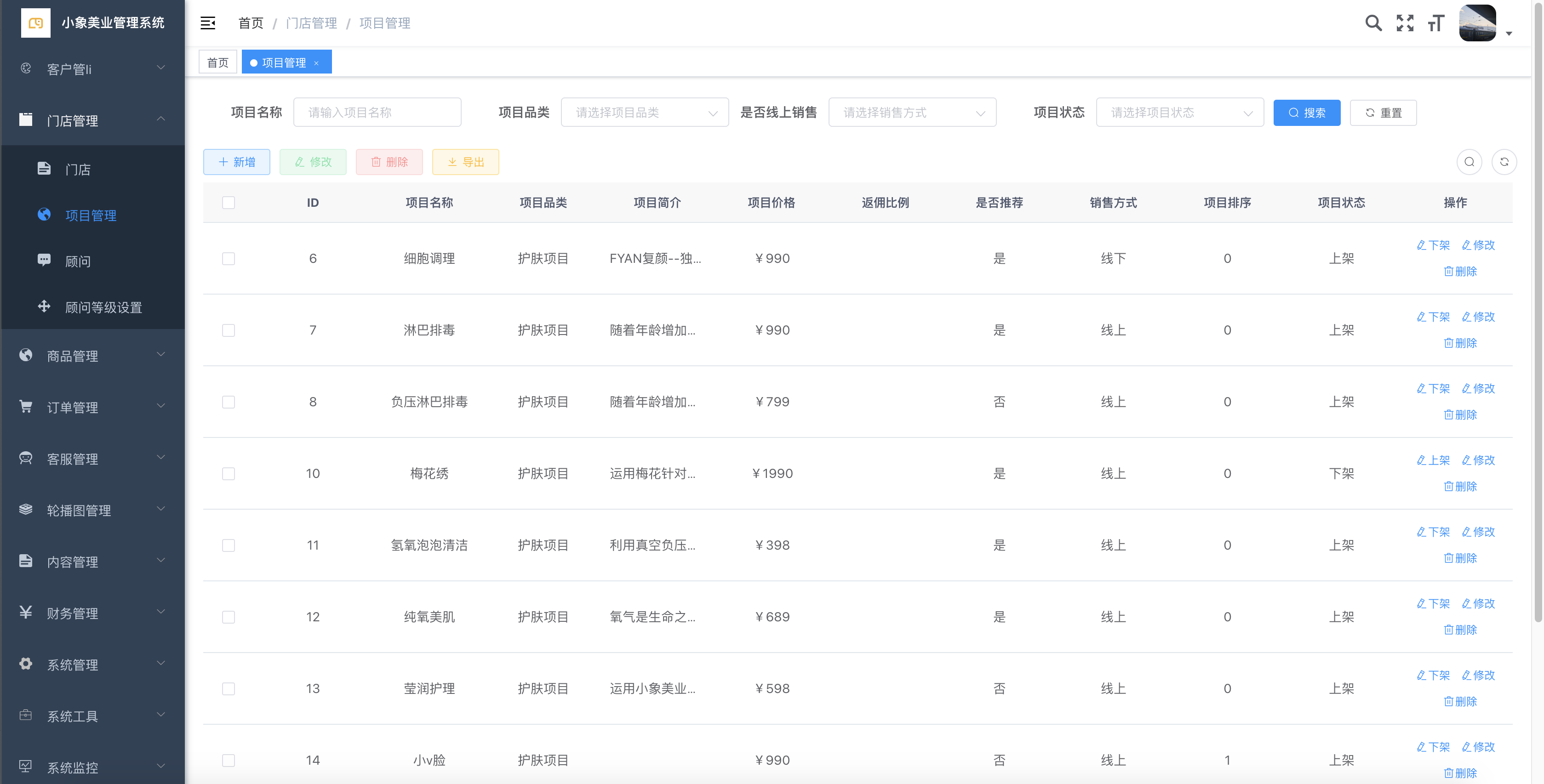 小象智慧美容小程序支持全国连锁美容机构线上客户管理、门店管理、商品管理、项目管理,支持在线预约,在线下单,特色项目展示等功能,项目由成熟上线产品改造而成,非常适合美容连锁门店使用,非常适合企业或个人二次开发;