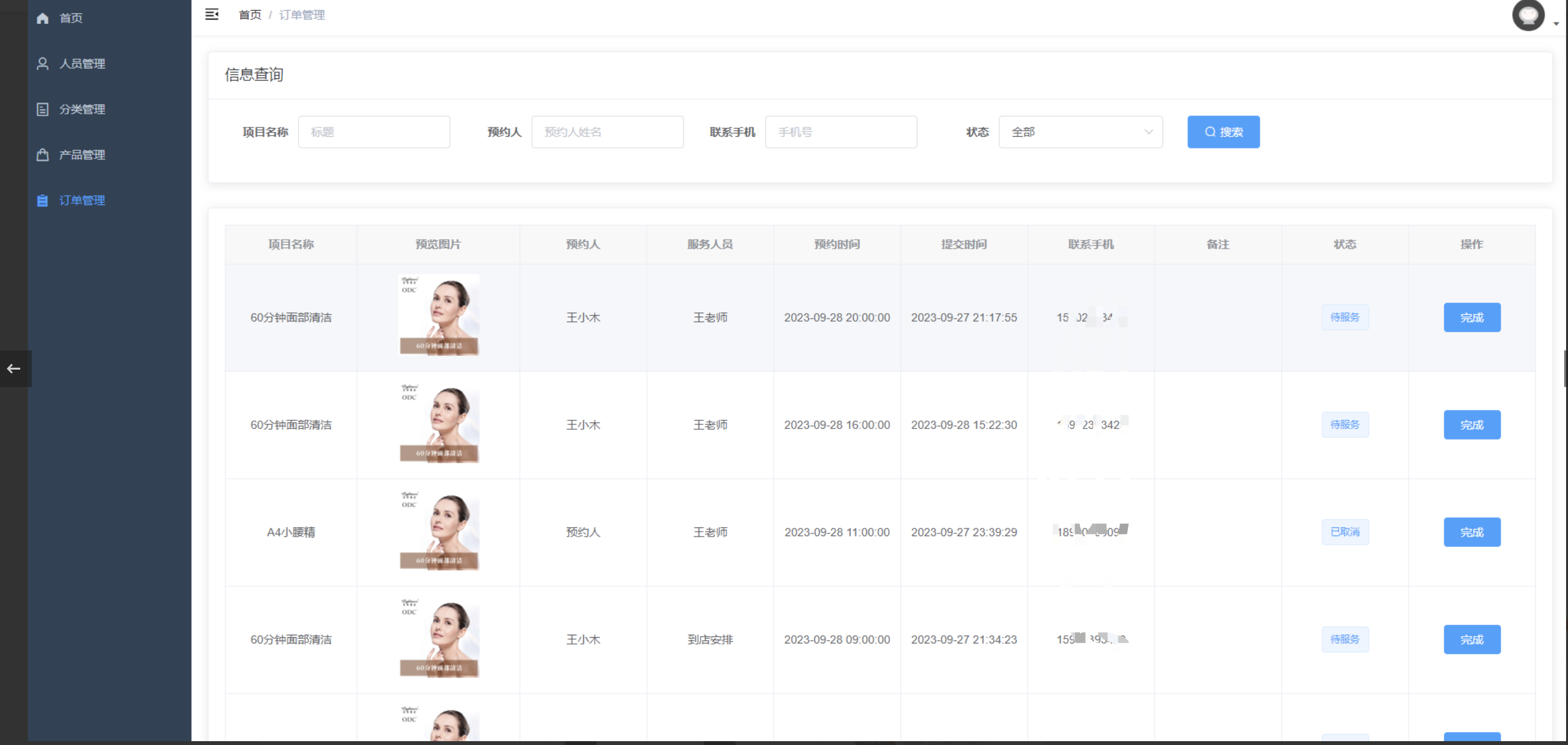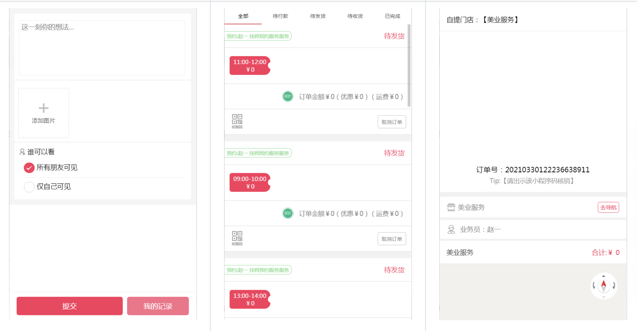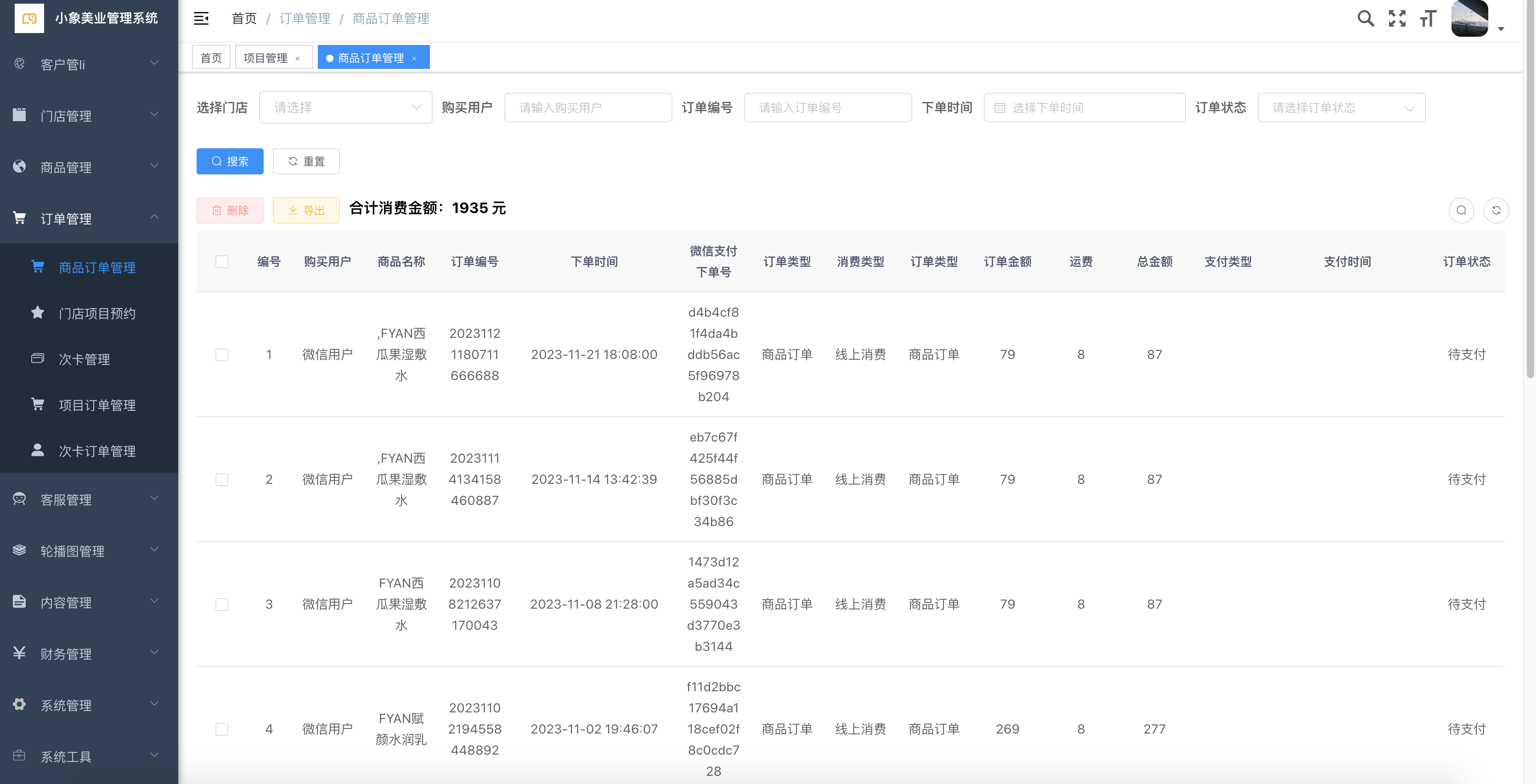 订单管理:商品订单管理、门店项目预约、次卡管理、项目订单管理、次卡订单管理。