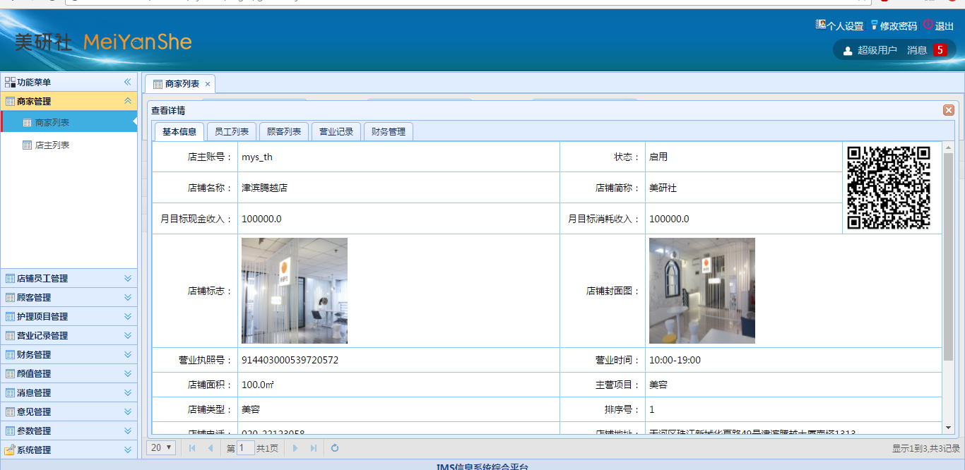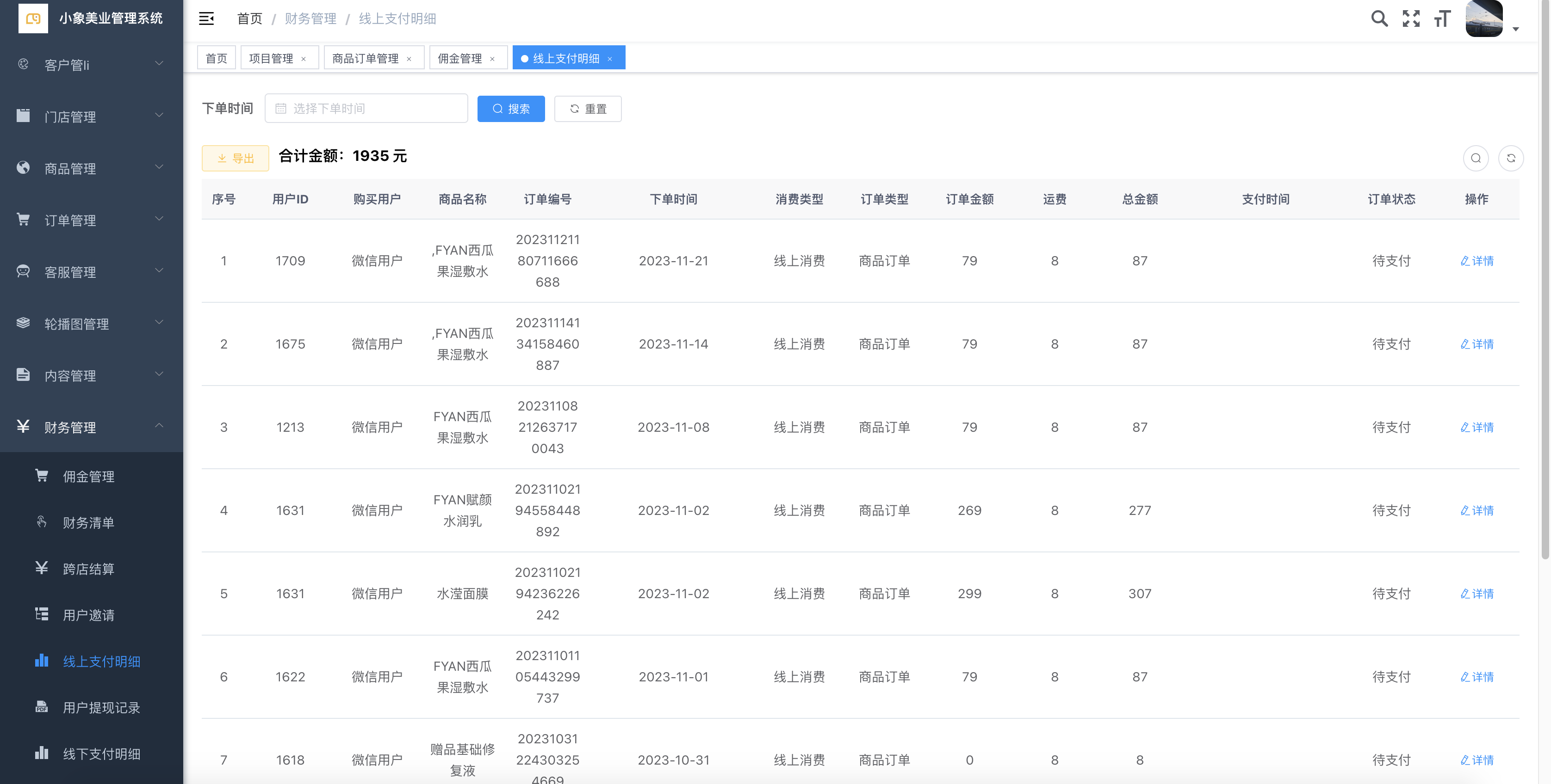 财务管理:佣金管理、财务清单、跨店结算、用户邀请、线上支付明细、用户提现记录、线下消费明细等。