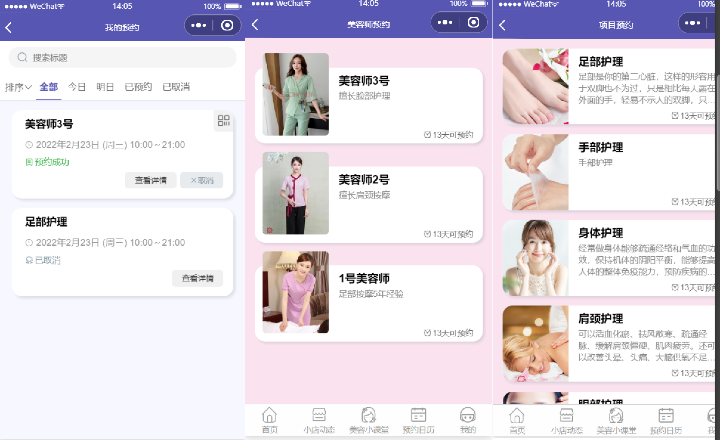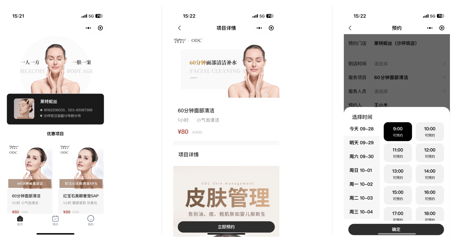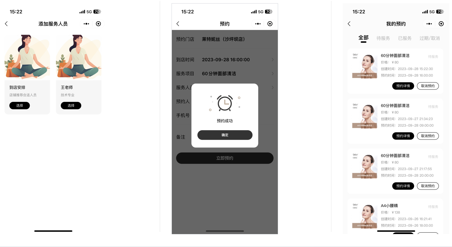 美容行业门店服务预约小程序,适用于线下个体户,有自己的品牌或者门店的商家,店主,做美容,美发,医美,按摩等服务性质行业的在线预约,管理,可实现客户在线查看,服务预约,到期提醒,商家在线管理服务项目,服务订单,处理服务,通知客户等,增强门店品牌效应,展示产品,提高服务产品营销传播途径,给客户带来信任感,降低销售阻力。