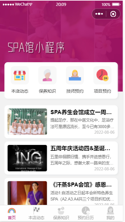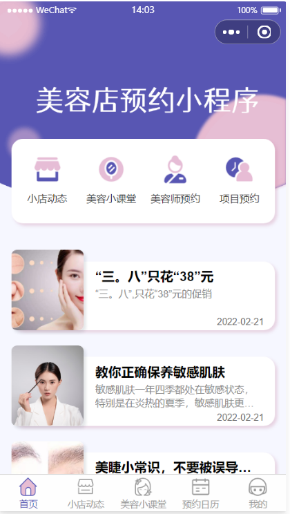 美容机构预约小程序,功能包括门店动态,美容小贴士,美容师预约,美容项目预约,预约时间不受限,打开美容院预约小程序,可以实现时间,有利于美容院做好资源配置工作,减少顾客到店后减少因服务不及时造成等待,采用腾讯提供的小程序云开发解决方案,无须服务器和域名