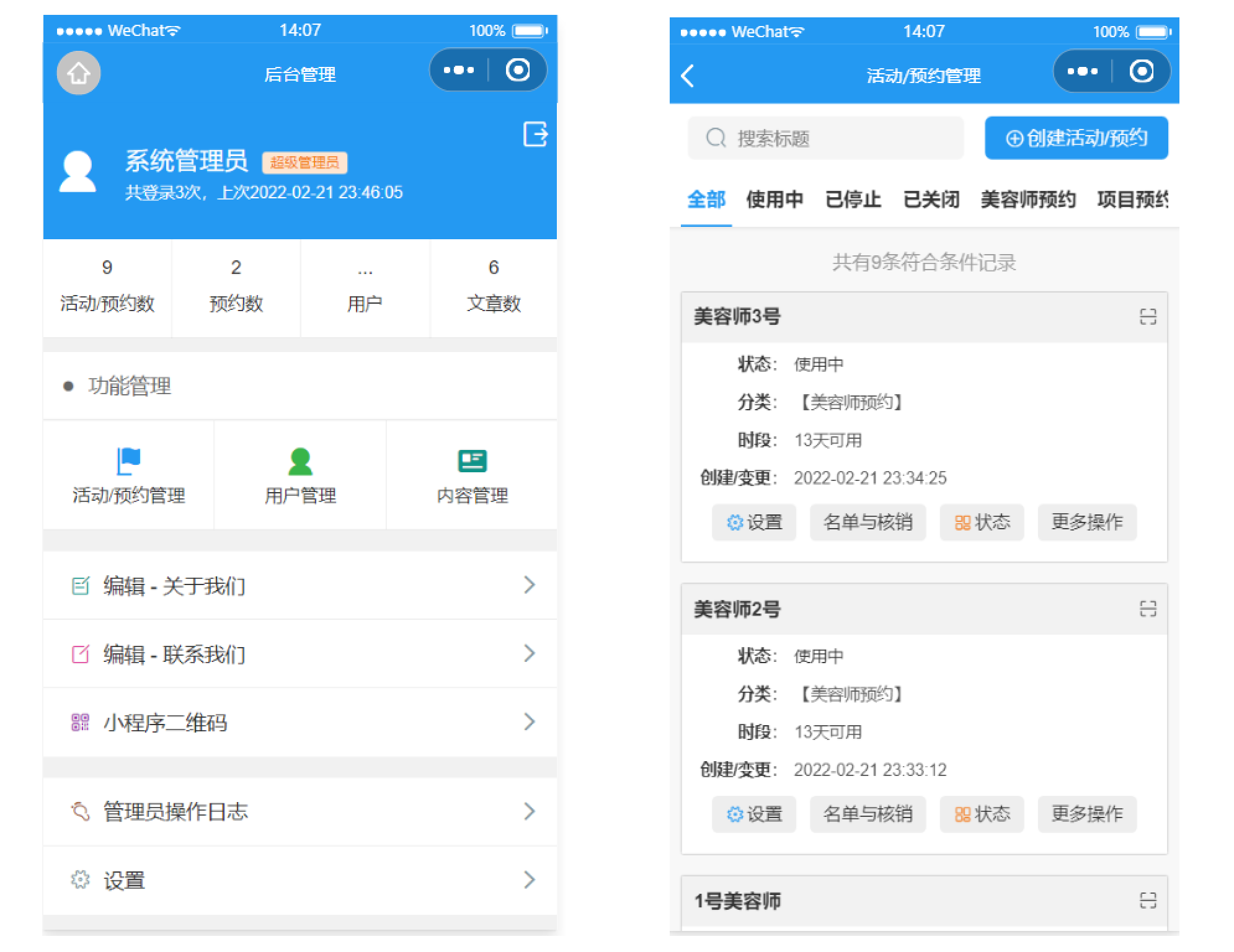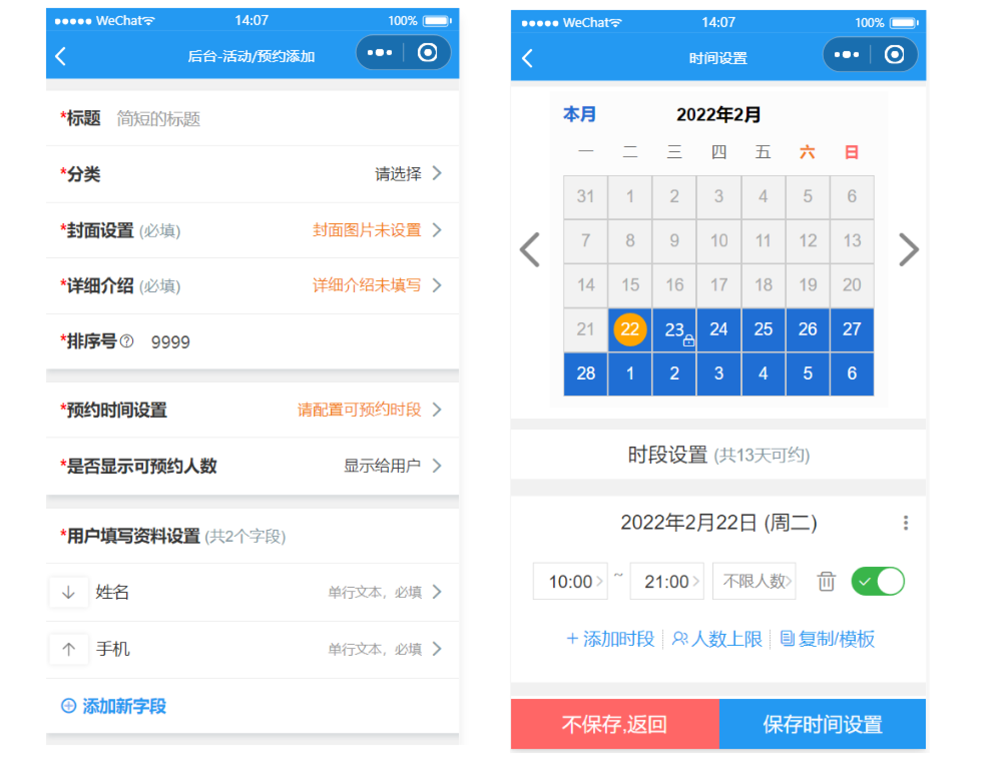 美容项目预约管理:开始/截止时间/人数均可灵活设置,可以自定义客户预约填写的数据项