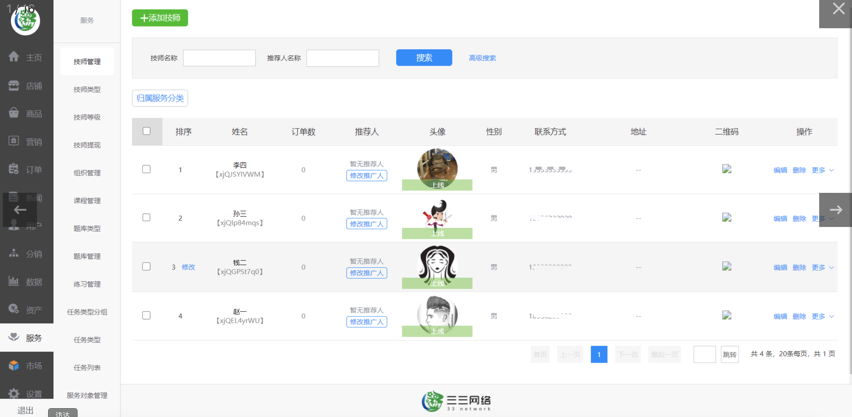 门店管理:门店配置、项目管理、顾问、顾问等级设置。