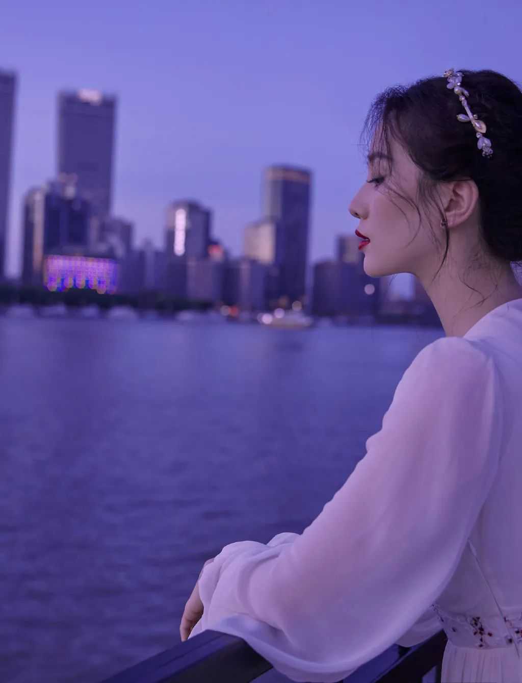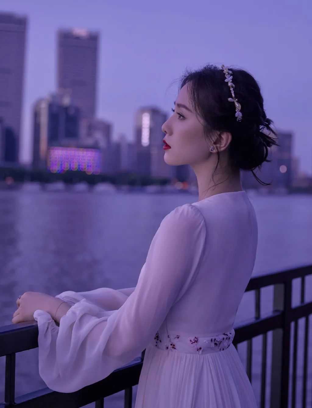 珍珠从来都吸引着女性的目光,它闪烁着的晕彩珠光,温润细腻、浑然天成,所谓珠光宝气是也,运用在发箍上能够提升端庄的气质。刘诗诗头戴珍珠枝蔓发箍,身穿拖地白色长裙,站在夜景下的黄埔江边,唯美动人,仙气飘飘。