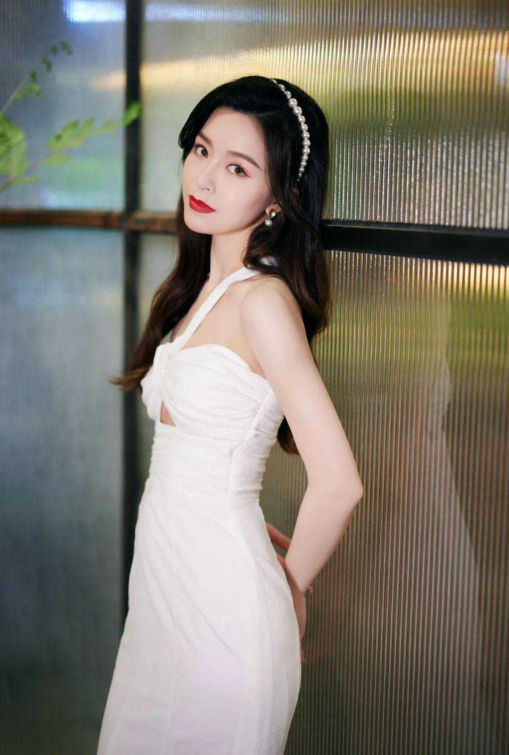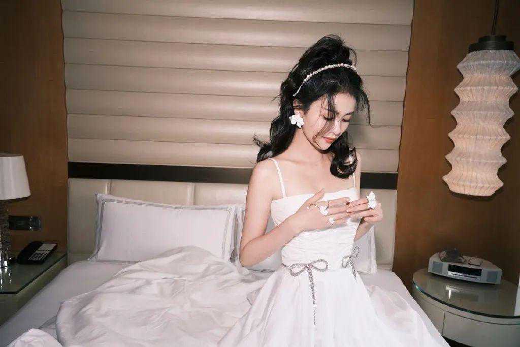 白鹿身穿白色吊带背心和小短裙,在酒店床上拍照,甜美元气,戴珍珠配饰,化身在逃公主。