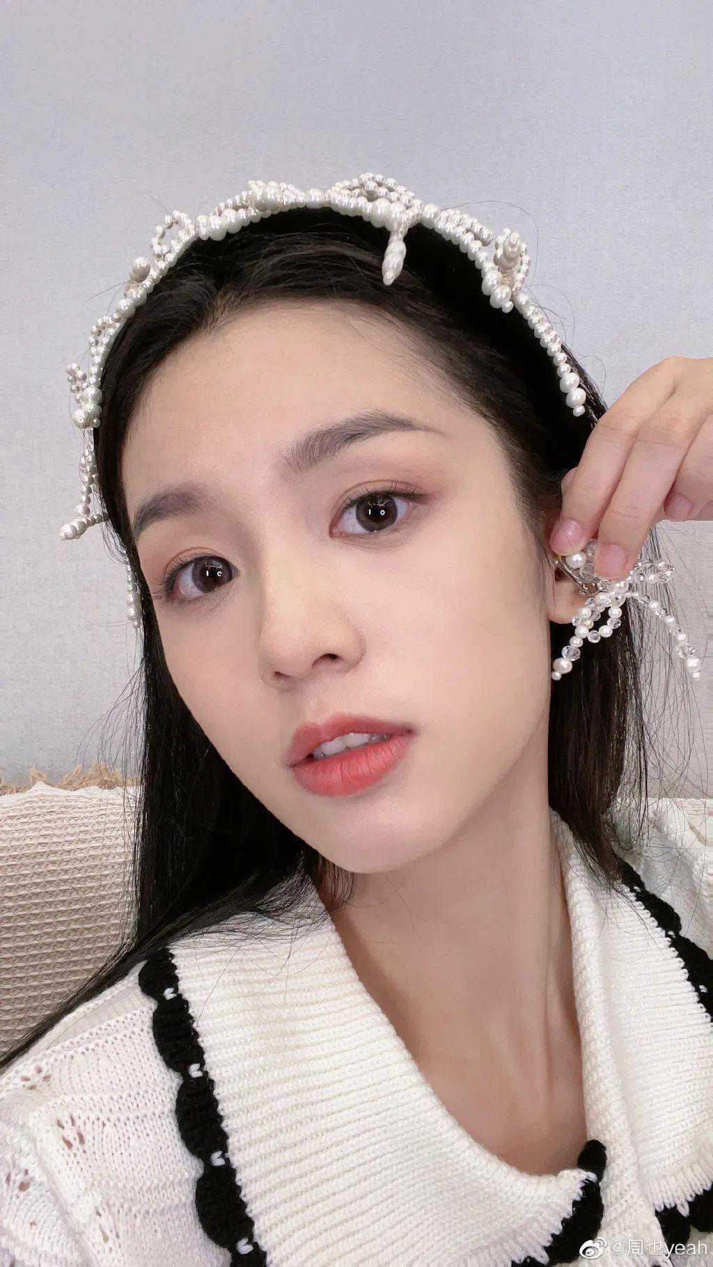 周也身穿白色短款花边娃娃领针织开衫,头戴珍珠蝴蝶结装饰发箍,搭配水晶珍珠蝴蝶结耳夹,复古淑女,甜美可人。也子怼脸拍状态真的太好了!