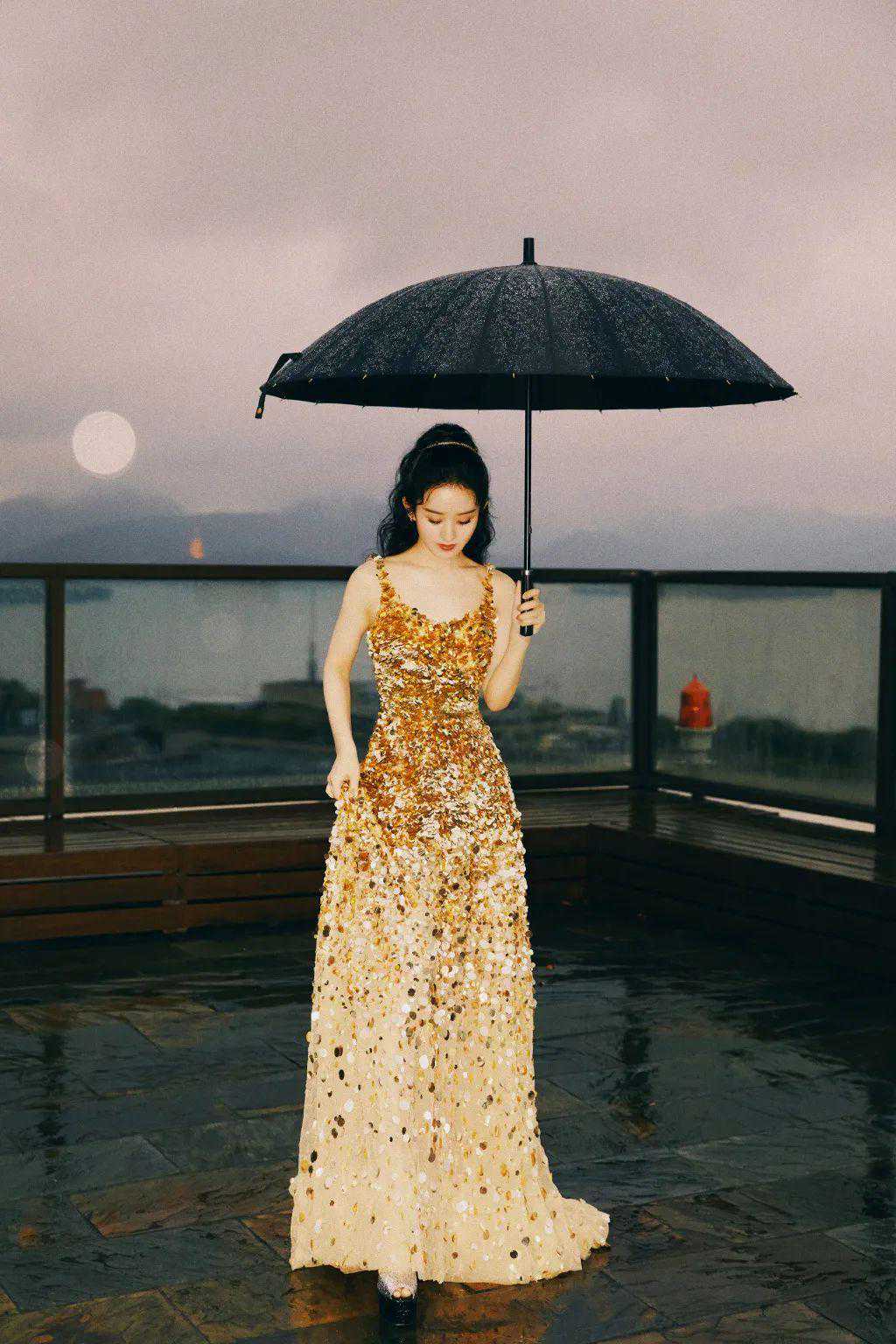 金属饰品释放出冷艳光芒,展现出骨子里的摩登风格。赵丽颖一袭鎏金闪亮的长裙,搭配金色发箍大波浪高马尾,在雨中撑伞复古优雅,一颦一笑皆动人。
