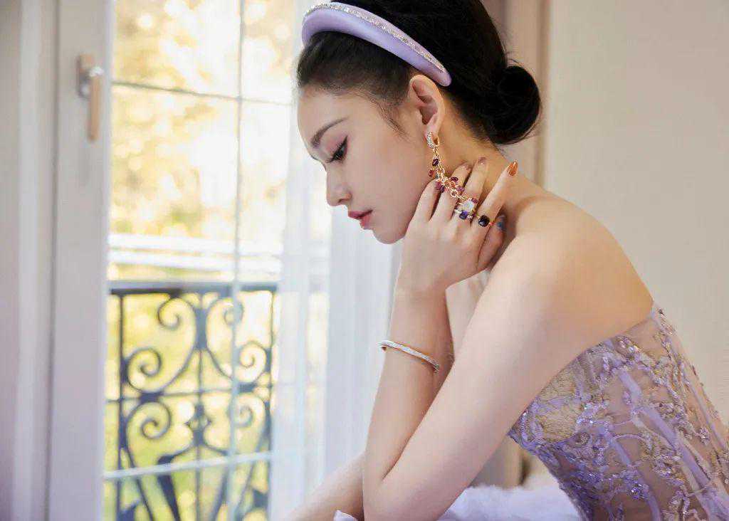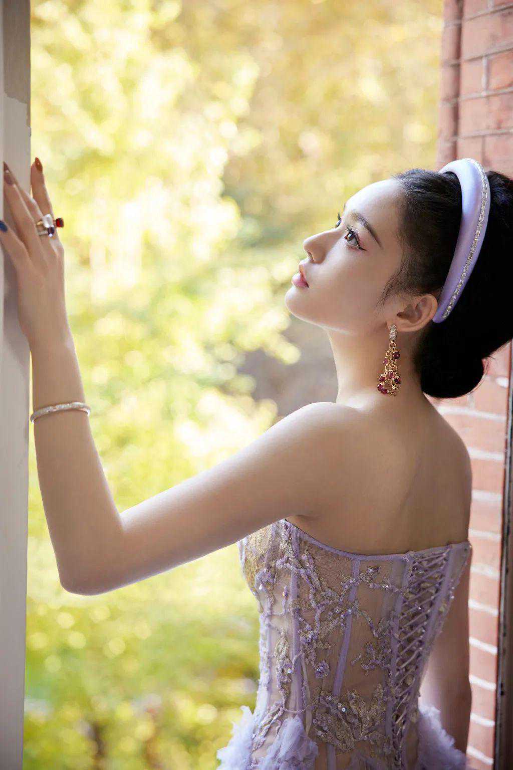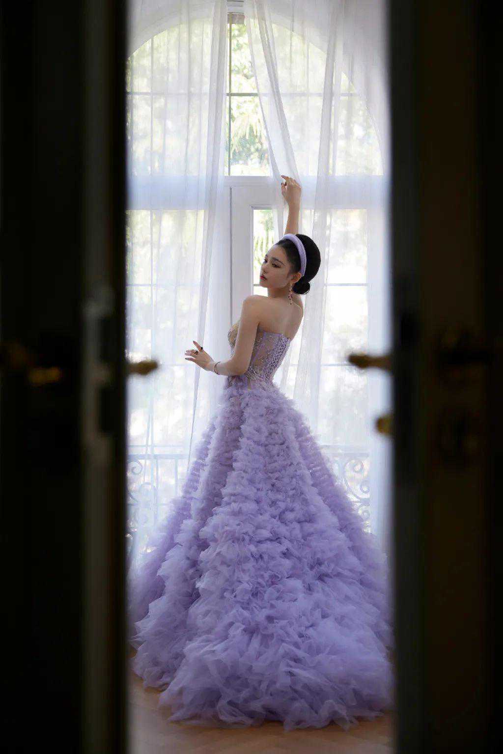 林允梦幻紫纱裙和复古赫本发型,搭配出高贵静谧感,饱满多汁的多肉葡萄一枚~