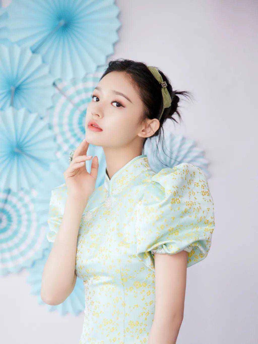 林允水绿旗袍温婉俏皮,搭配同色系的绿色蝴蝶结发箍,满满清新少女氛围感。