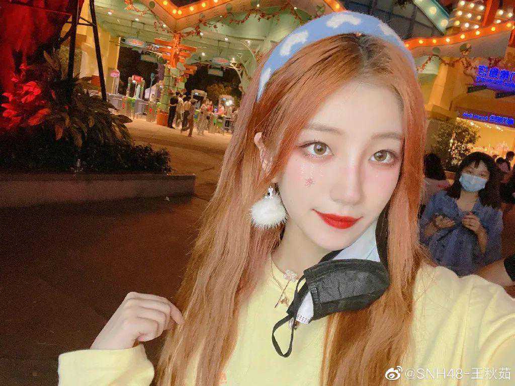 SNH48王秋茹佩戴蓝天白云配色的发箍,轻飘飘的很有仙气,爱心图案诉说着少女的心思。