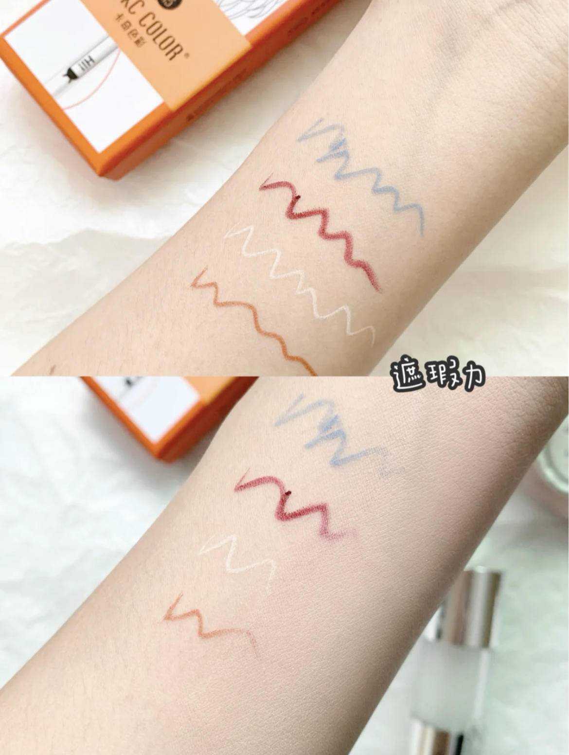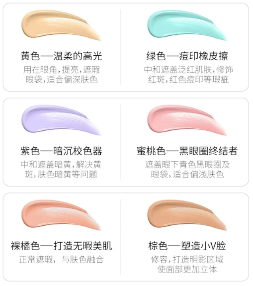 在上粉底之前可以先对肤色进行修色,改善肤色不均的问题。比如暗黄的地方用紫色遮瑕修饰,红血丝的地方用绿色,眼下泛青的血管和黑眼圈用橘色。