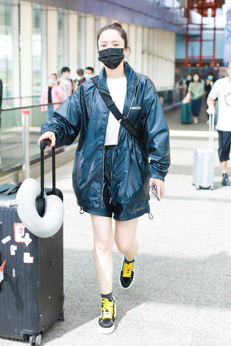 董璇,皮质外套+皮短裤+白色T恤+运动鞋酷感帅气。