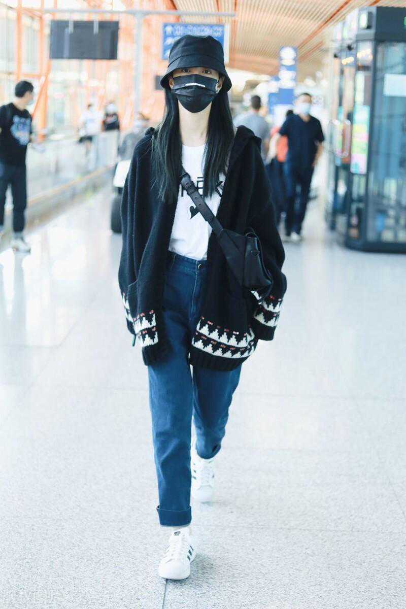 闫妮,连帽卫衣+牛仔裤+帆布鞋+棒球帽全黑Look。