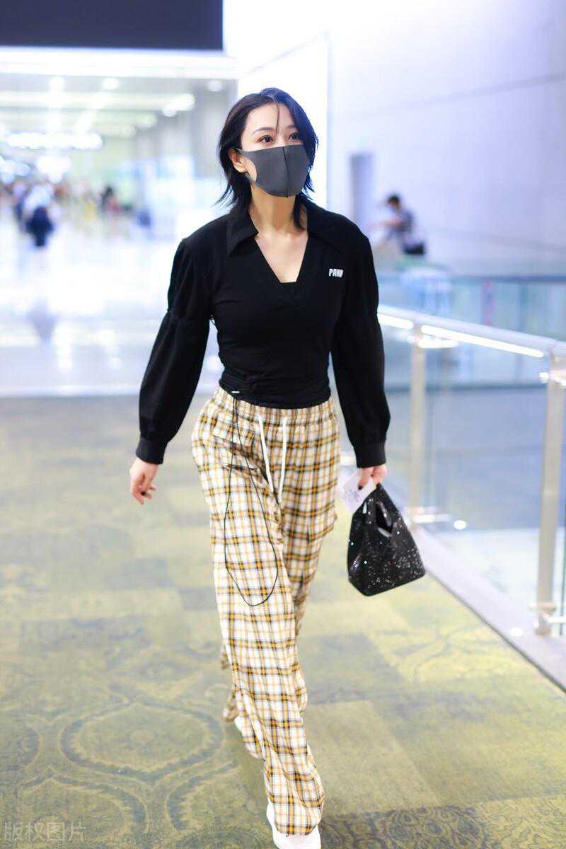 张馨予,黑色泡泡袖衬衫+格纹裤+小白鞋率性飒爽。