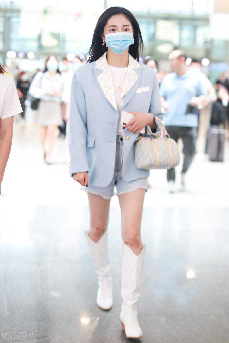 周洁琼,蓝色西装+白Tee+牛仔短裤+白色牛仔靴+Dior包袋大气清甜。