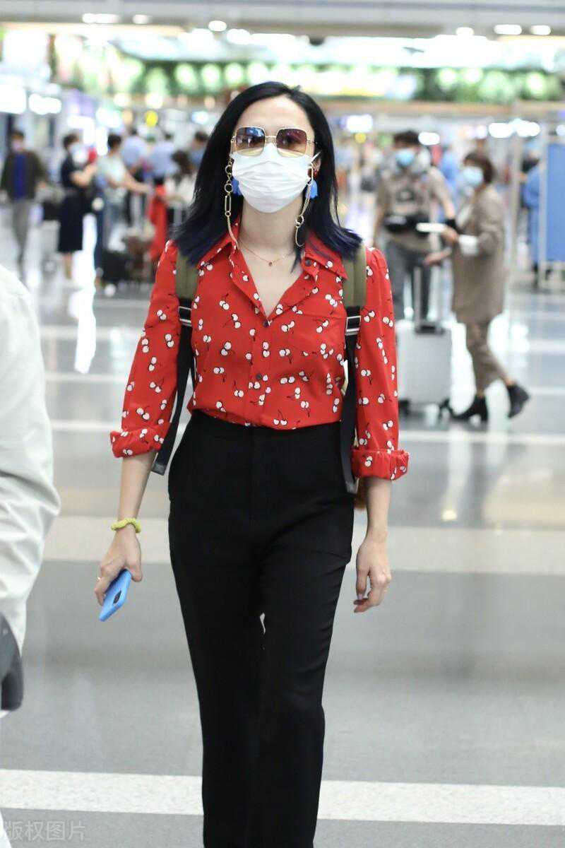 姚晨,红色印花衬衫+黑色开衩裤+小白鞋+链条墨镜个性优雅。