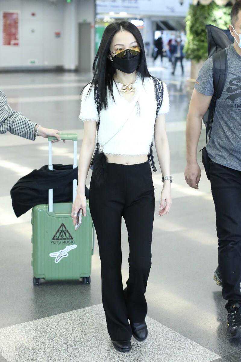 张韶涵,白色露脐海马毛衣+黑色休闲裤+Dior背包身材苗条。