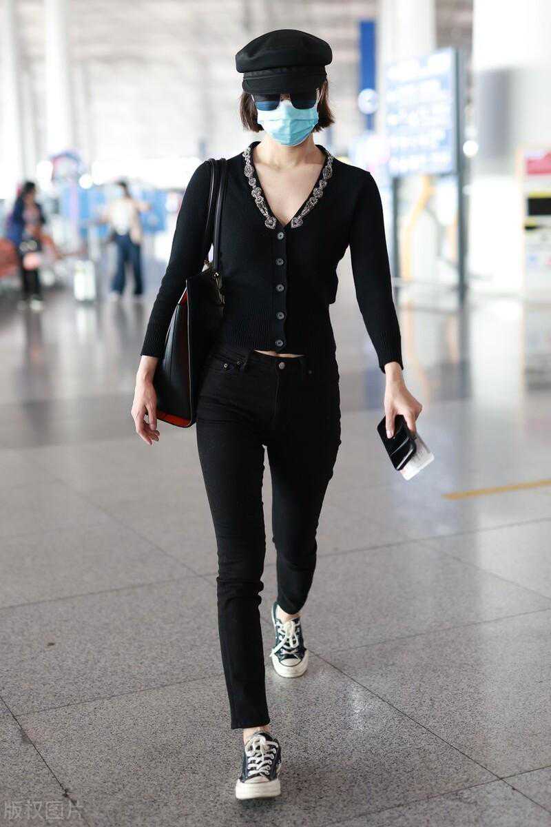 王珞丹,黑色V领针织衫+牛仔裤+帆布鞋+贝雷帽复古时髦。