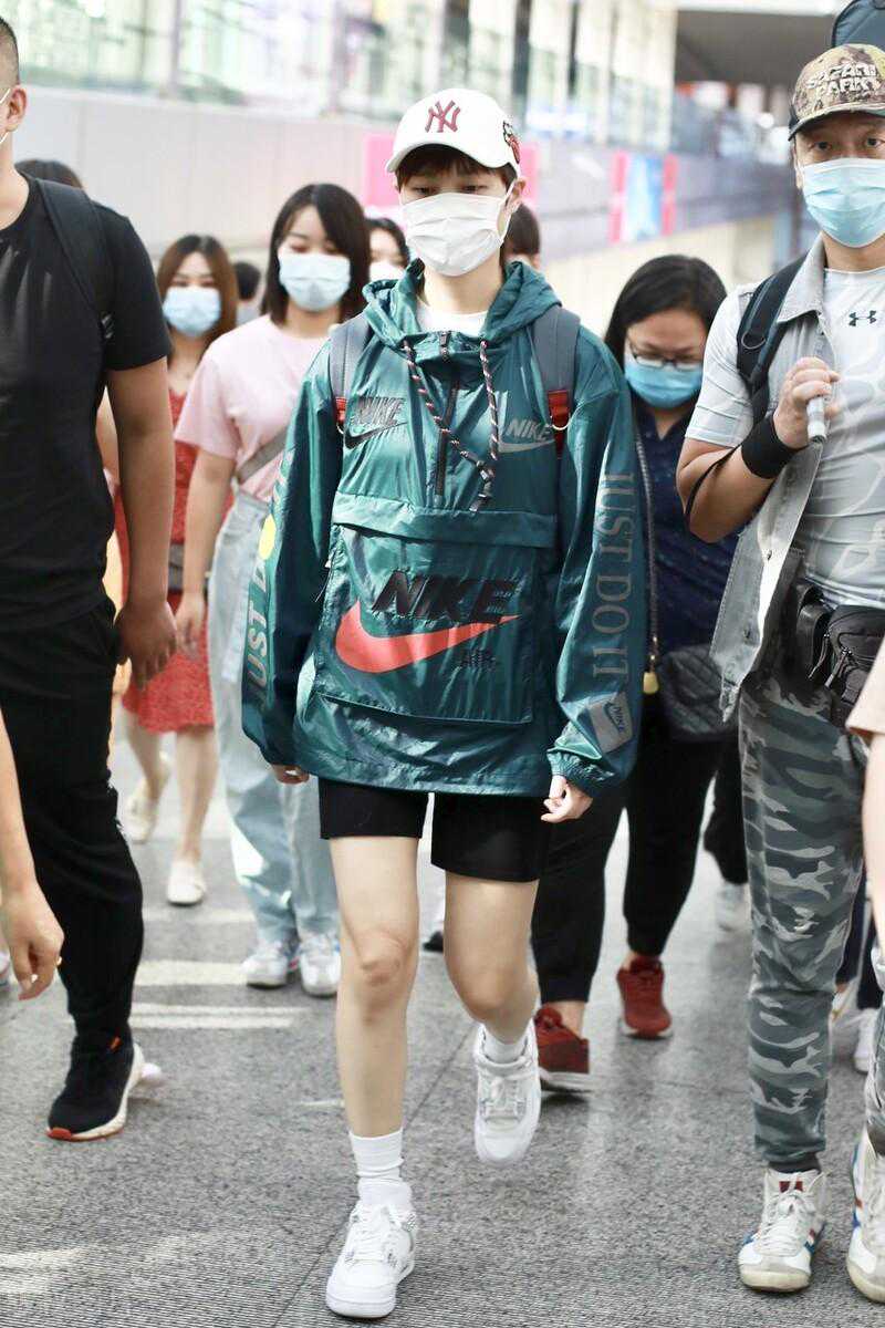 李宇春,Nike墨绿色防风外套+骑行短裤+白袜子+白色运动鞋+棒球帽运动随性。