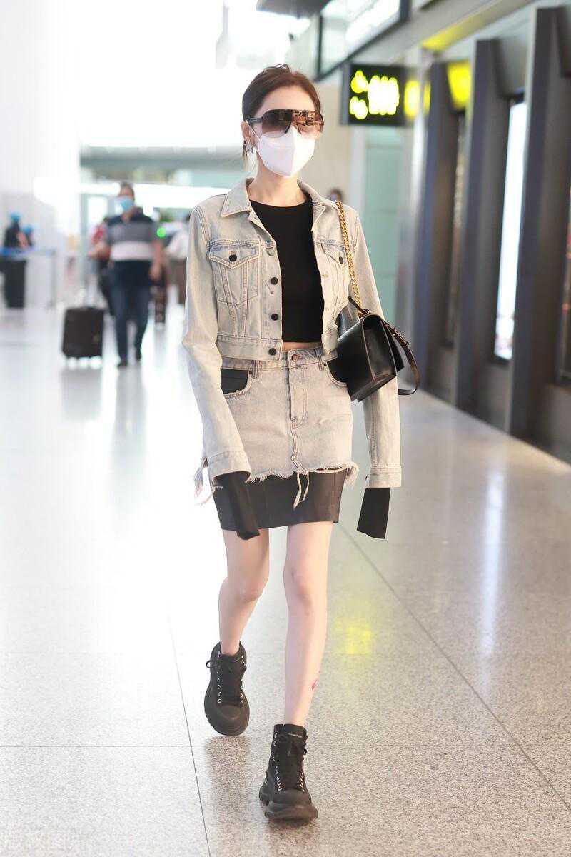 张天爱,短款牛仔衣+牛仔皮革拼接短裙+AlexanderMcQueen厚底鞋热辣酷飒。