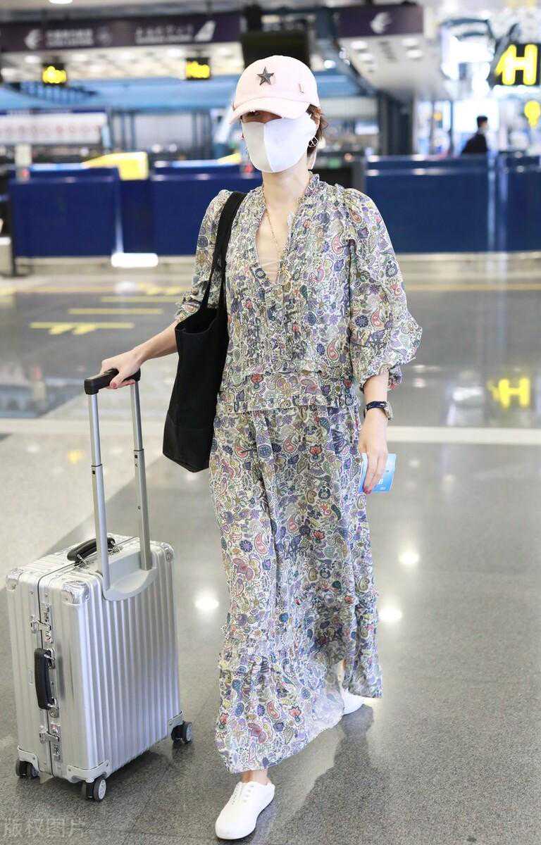 马伊俐,长款碎花连衣裙+小白鞋+棒球帽+帆布包随性大气。