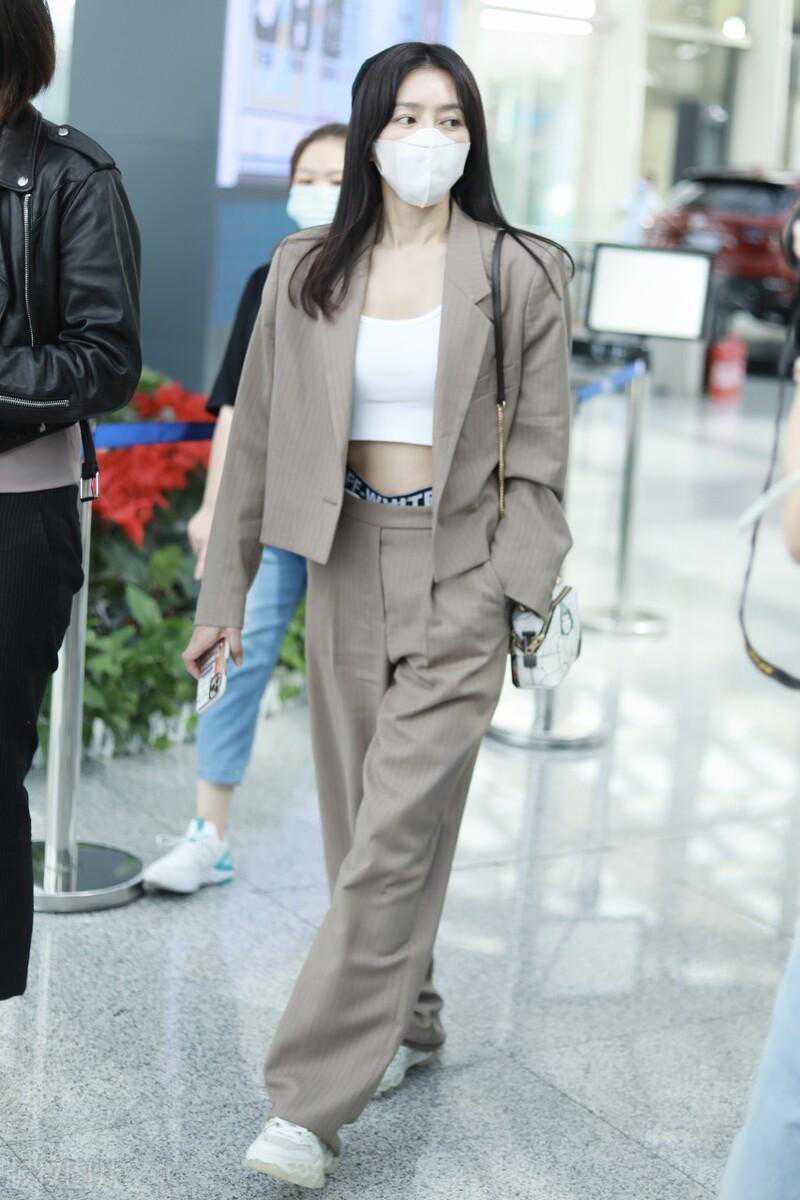 秦岚,卡其色短西装+西裤+白色短内搭优雅干练。