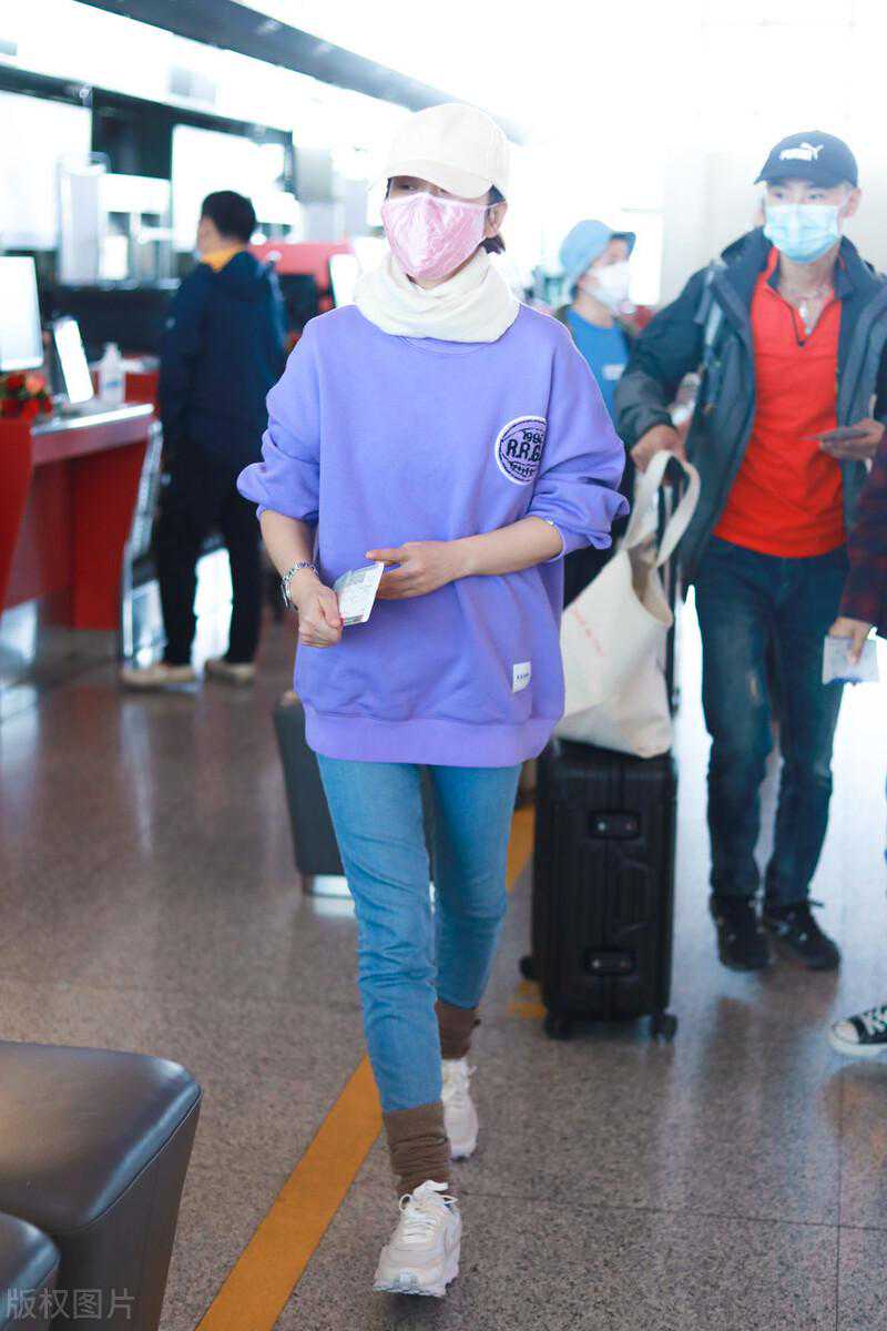海清,蓝色卫衣+牛仔紧身裤+袜子+白色运动鞋休闲随性。