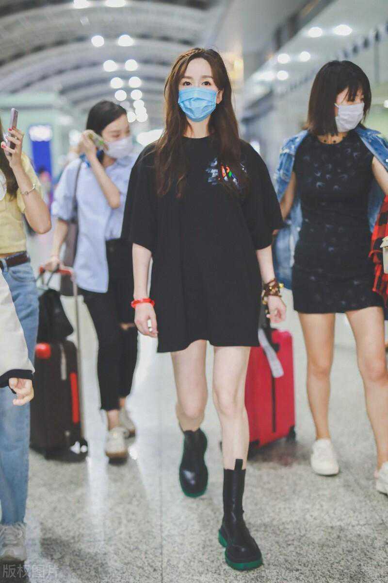 娄艺潇,藏青色T恤裙+黑色短靴甜美休闲。