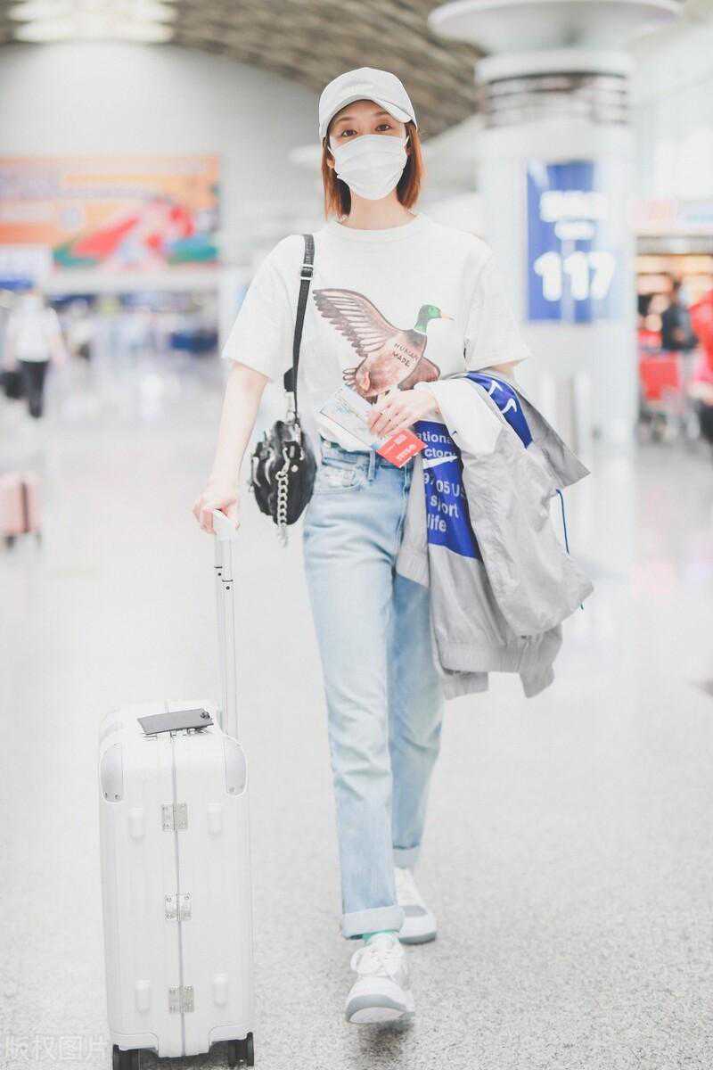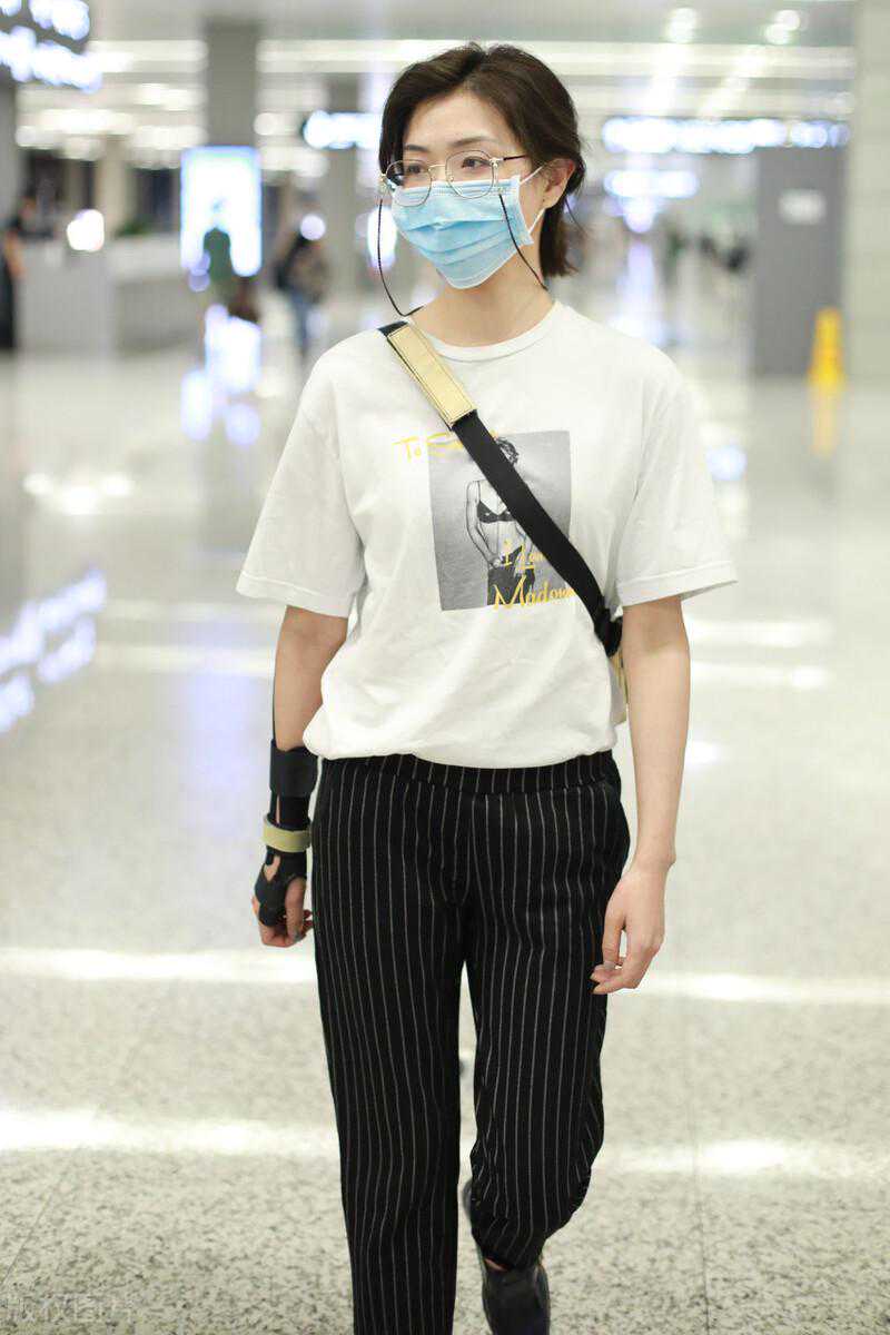 万茜,白色人像tee+条纹裤+斜挎包简约清爽。