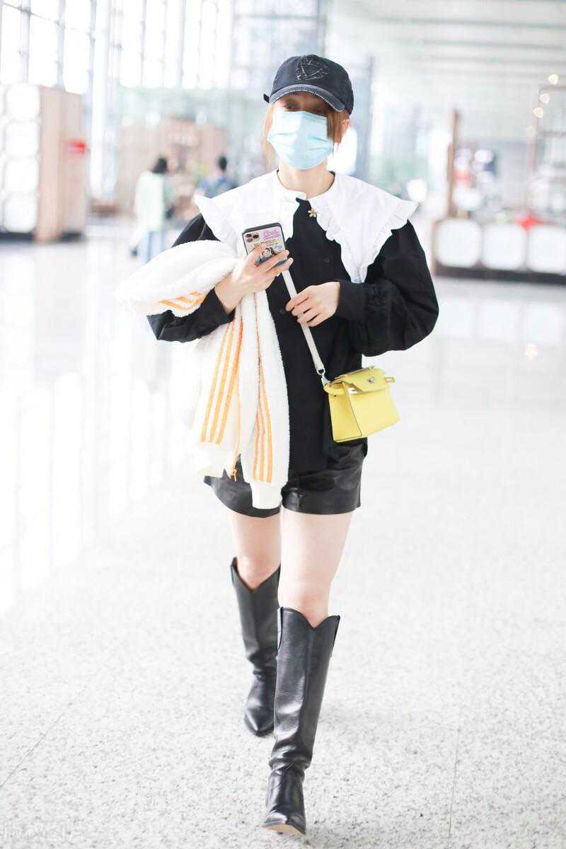 吴昕,黑色娃娃领衬衫+短裤+Hermes手袋甜美可爱。