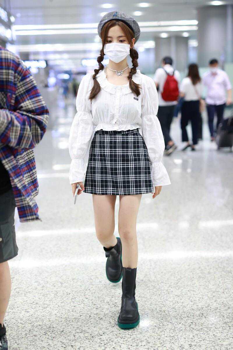 杨超越,白色衬衫+格纹短裙+贝雷帽甜美可爱。