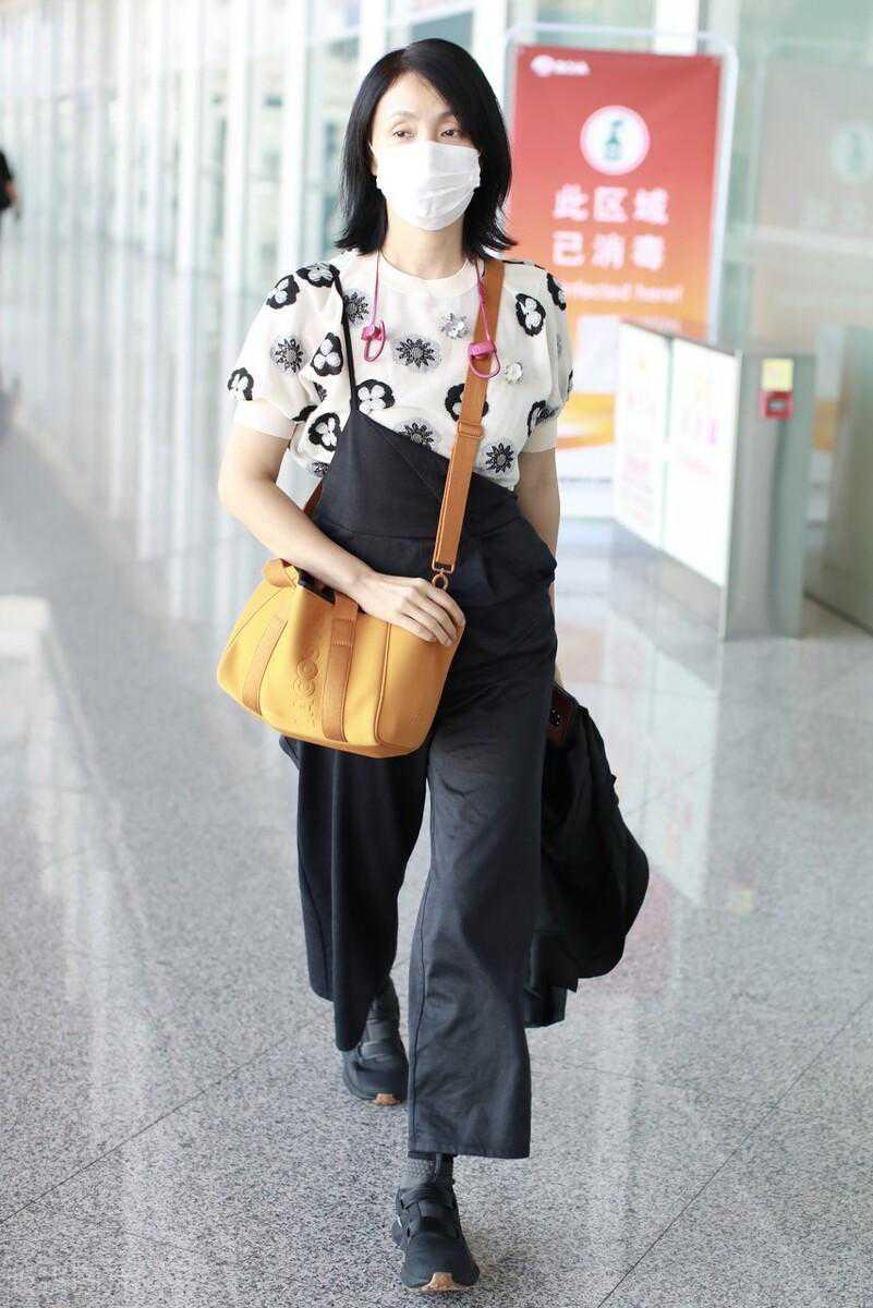 陶虹,白色针织衫+黑色背带裤+橘色手袋减龄活泼。