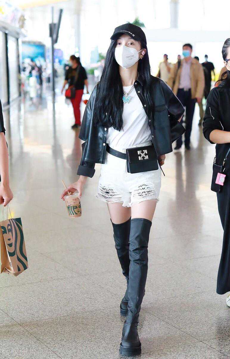 吴宣仪,皮质短外套+破洞牛仔短裤+过膝长靴+Off-White腰包+棒球帽时尚随性。