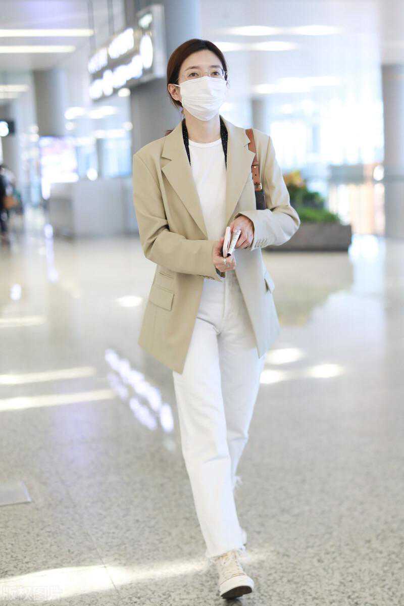 江疏影,卡其色西装+白色牛仔裤+金丝边眼镜+Celine腋下包+帆布鞋优雅干净。