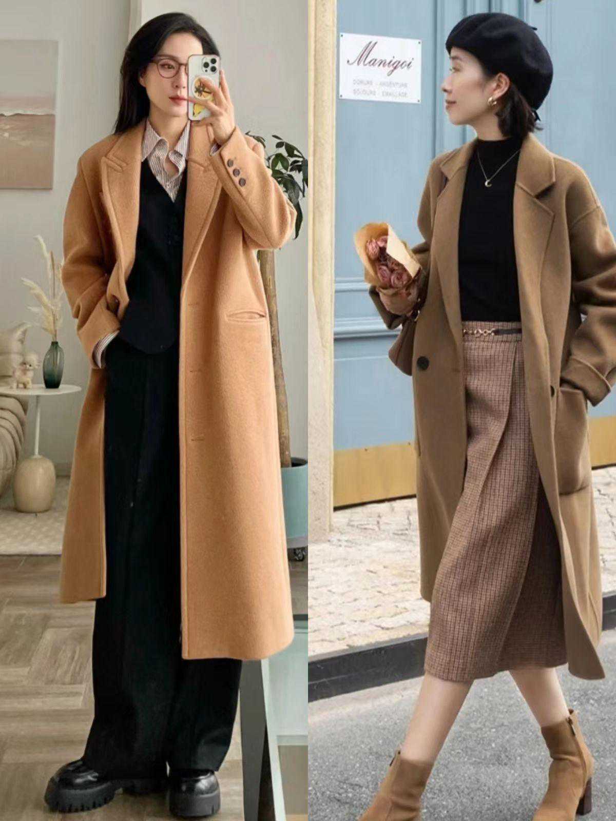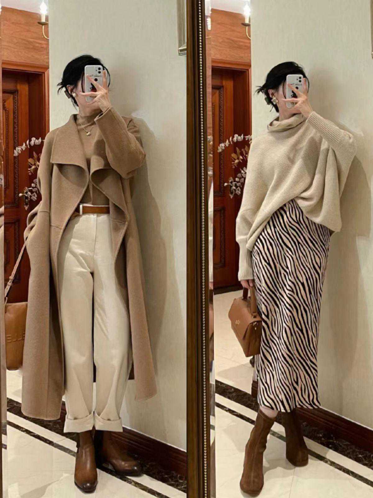 驼色大衣在配色上也很简单,搭配黑色、白色或者其他大地色系都行。比如博主小娇用驼色大衣配驼色烟管裙,穿出轻熟感。