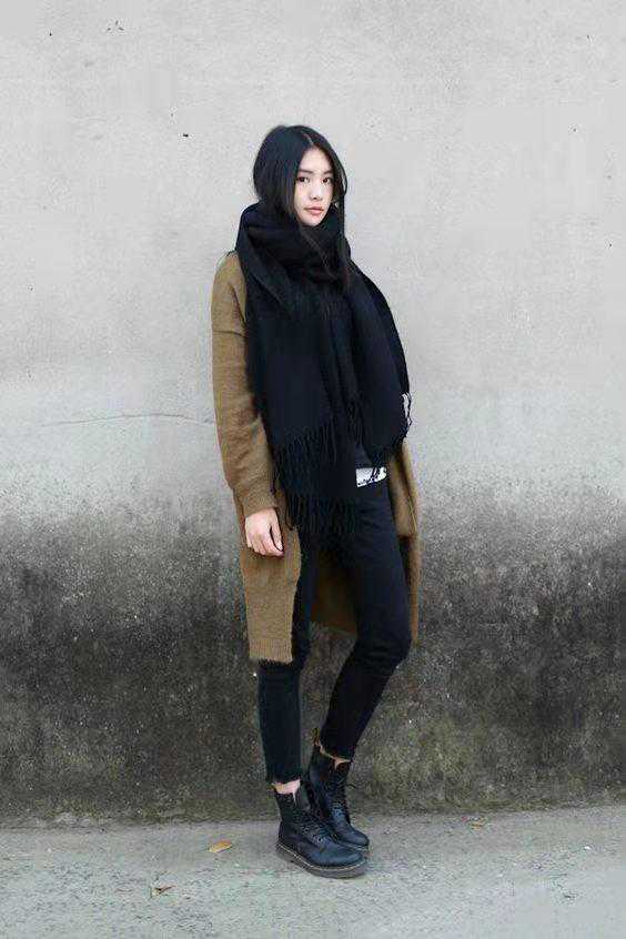 牛仔小脚裤和高帮马丁靴,这两种单品的受众群体都是比较广泛的,我们在穿着的时候可以将裤脚塞进马丁靴的靴筒里面,起到了自然衔接的作用,不经意间就延长了双腿线条,所以将紧身裤和马丁靴搭配起来是毫无违和感的,上身搭配深棕色羊羔毛外套,形成了慵懒又显温柔的风格。