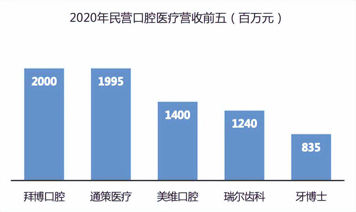 按2020年营收排名,牙博士是中国第五大民营口腔集团。而在华东地区,牙博士营收排名第二,仅落后于白马股通策医疗。