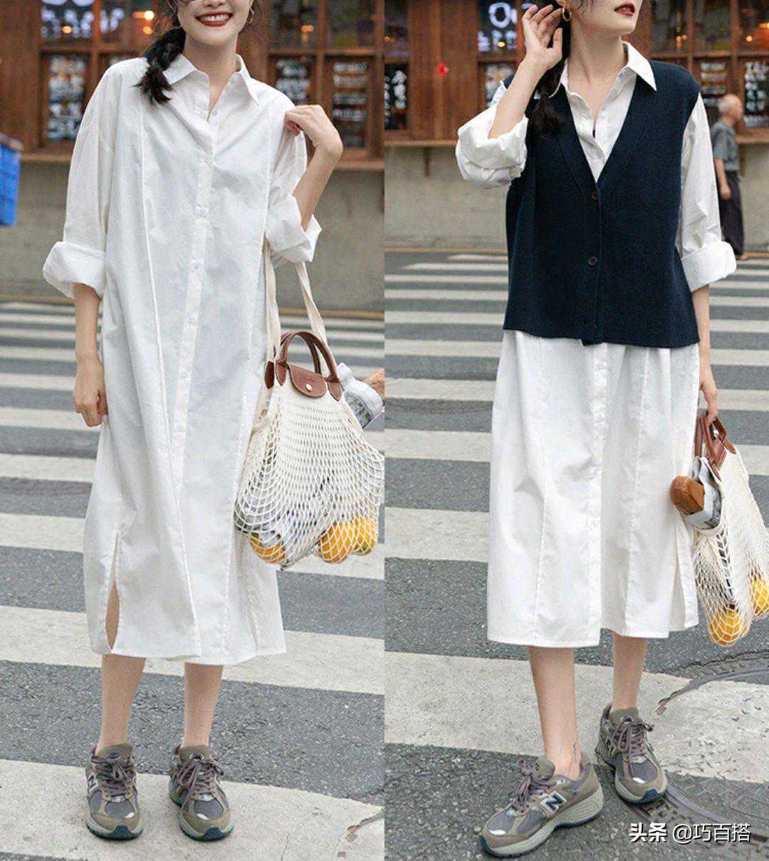 这次的衬衫裙+针织背心的层次感叠穿,个性又chic。还因为外短内长的穿法,修饰出了身材比例,上身既能走在潮流的前端,还穿出落落大方的感觉。