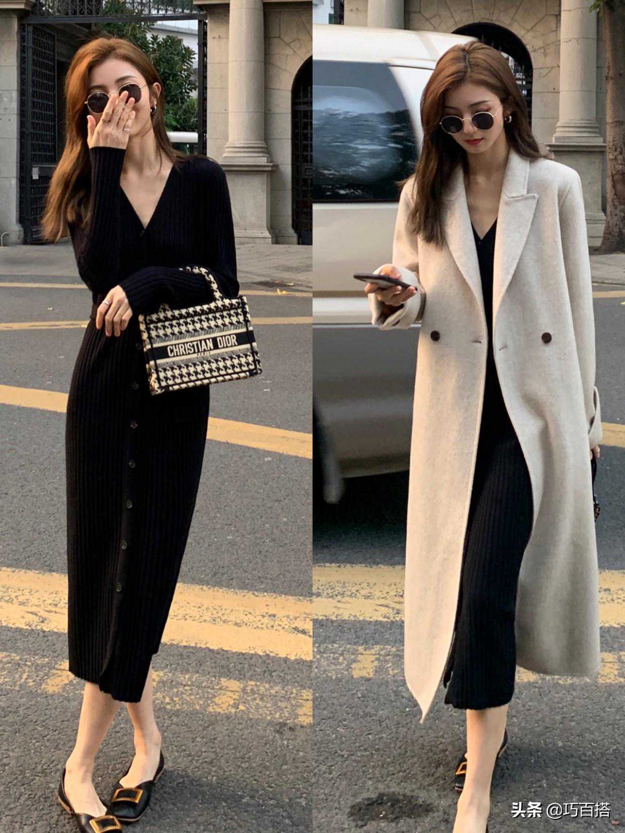 我们来看毛衣裙+大衣的经典秋季穿搭,两件单品都很常见,但是组合起来却穿出了优雅干练的气质。