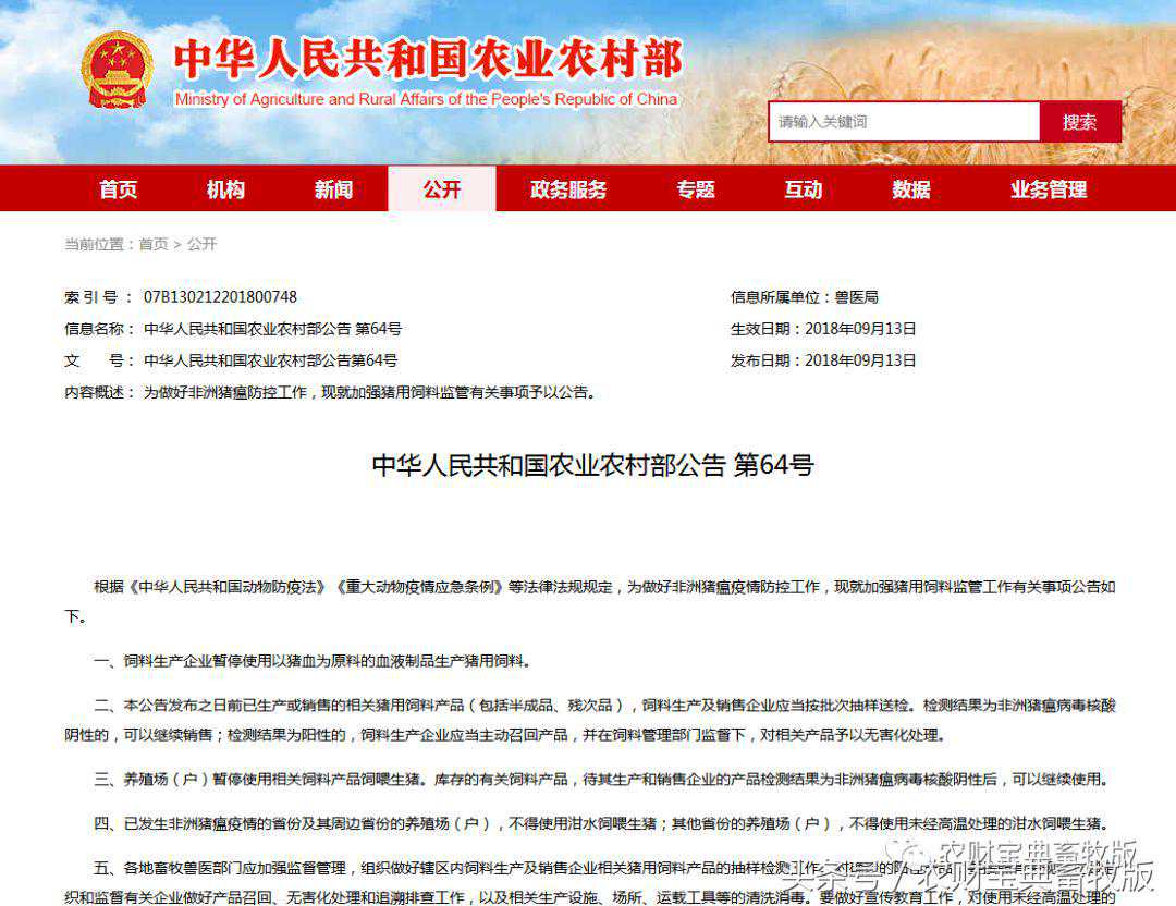 血浆蛋白粉存在安全隐患,农业农村部暂停其用于猪饲料《农财宝典》新牧网记者许婉近期,非洲猪瘟疫情在多省发生,国家正在加大力度控制非洲猪瘟的传播。9月13日,农业农村部发出第64号公告,要求饲料生产企业暂停使用以猪血为原料的血液制品生产猪用饲料。使用血浆蛋白粉作为原料添加,在饲料企业应用较普遍。非洲猪瘟...