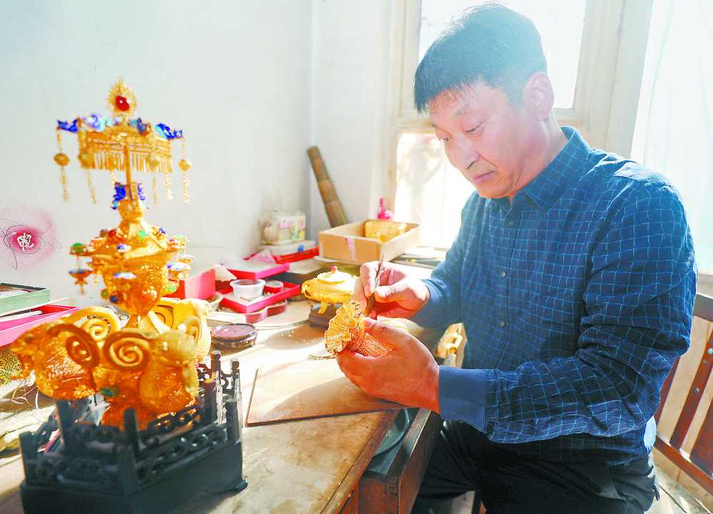 钳海强正在制作工艺品。古诗有云:“镂金像物艳于花”。这其中描述的就是玲珑雅致不凡的金银细工制作技艺。金银细工从其诞生之日起,便与皇家生活密不可分。它起源于春秋战国时“金银错”工艺,到东汉时期,掐丝、累丝、镶嵌等精细工艺大体完备,经唐至清1000多年的发展,金银器制作工艺更趋完善。明清为鼎盛时期,距今...