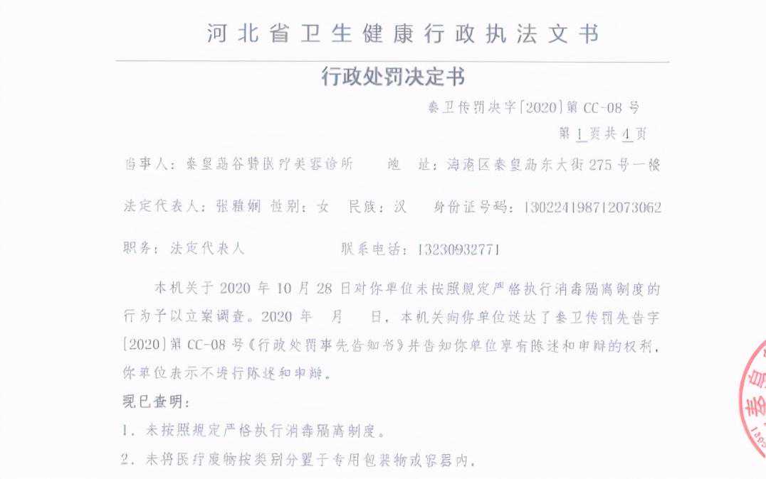 近期,秦皇岛市卫生健康委员会通报日常监督检查结果,多家医院、美容机构存在问题,现将检查发现的违规问题进行公示秦皇岛多家医院、美容机构存在问题秦皇岛谷赞医疗美容诊所法定代表人:张雅娴身份证号码:130224********3062违法行为:未严格执行消毒隔离制度等案违法事实:1、未严格执行消毒隔离制度...