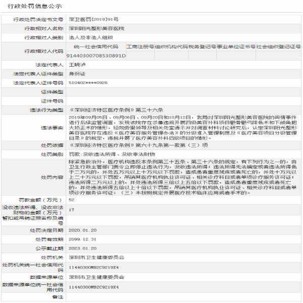 深圳阳光整形美容医院违规开展“医疗美容外科四级项目”被罚69万元 近日又遭消费者投诉“毁容”