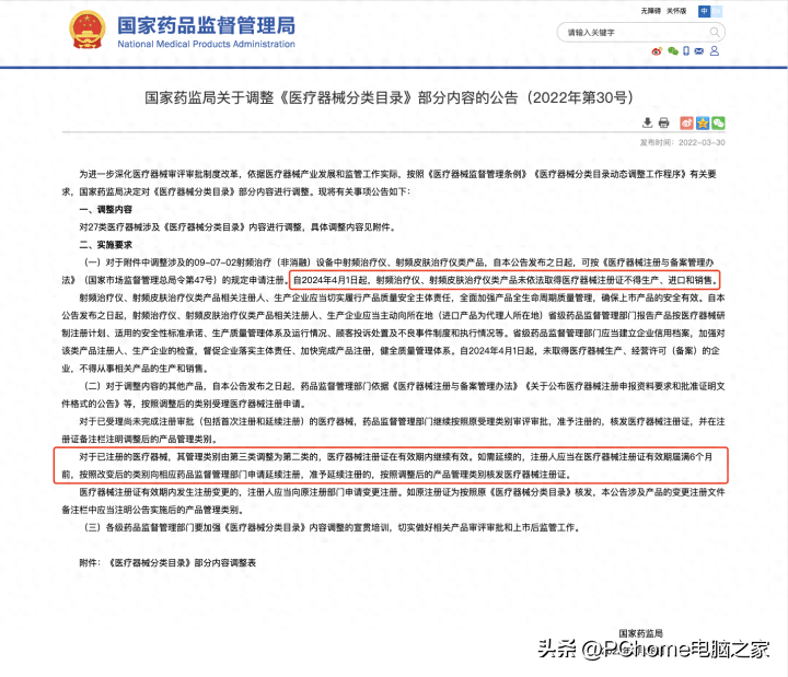 2022年3月,国家药监局发布《关于调整〈医疗器械分类目录〉部分内容的公告》(以下简称30号公告),明确射频治疗仪、射频皮肤治疗仪类产品按照第三类医疗器械管理。自2024年4月1日起,该类产品未依法取得医疗器械注册证不得生产、进口和销售。日前,国家药监局器械注册司、器械监管司相关负责人对此公告进行解...
